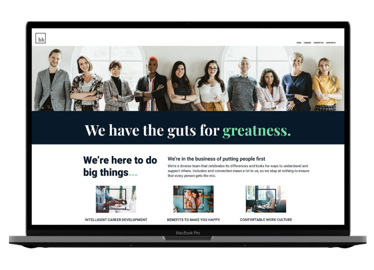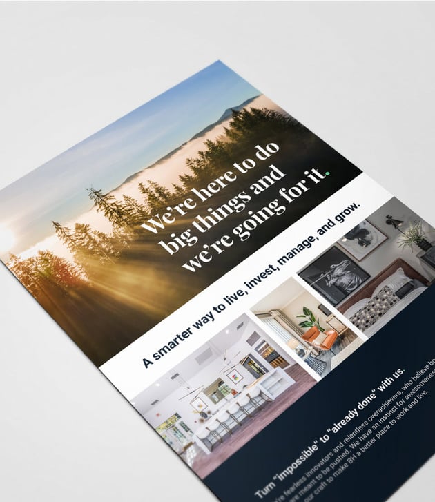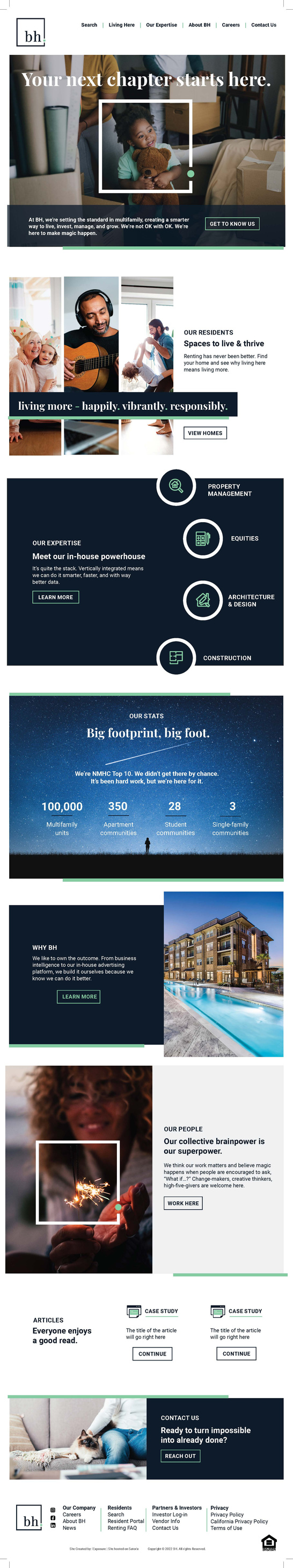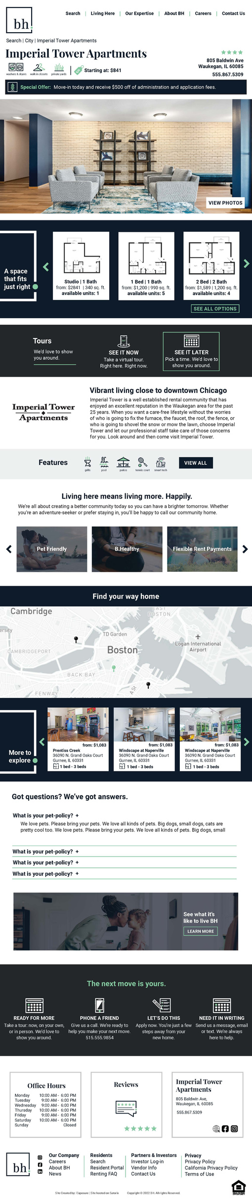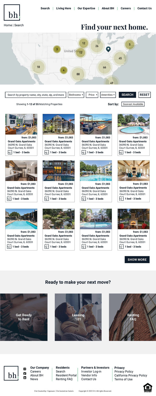 Collaborating with a developer, I designed the BH website, incorporating the new brand's elements across all property pages. The goal was to convey BH as a fun and innovative property management company that takes its role seriously. We aimed to make apartment shopping an "Amazon easy" experience, ensuring the website's pages were intuitively structured for easy navigation.