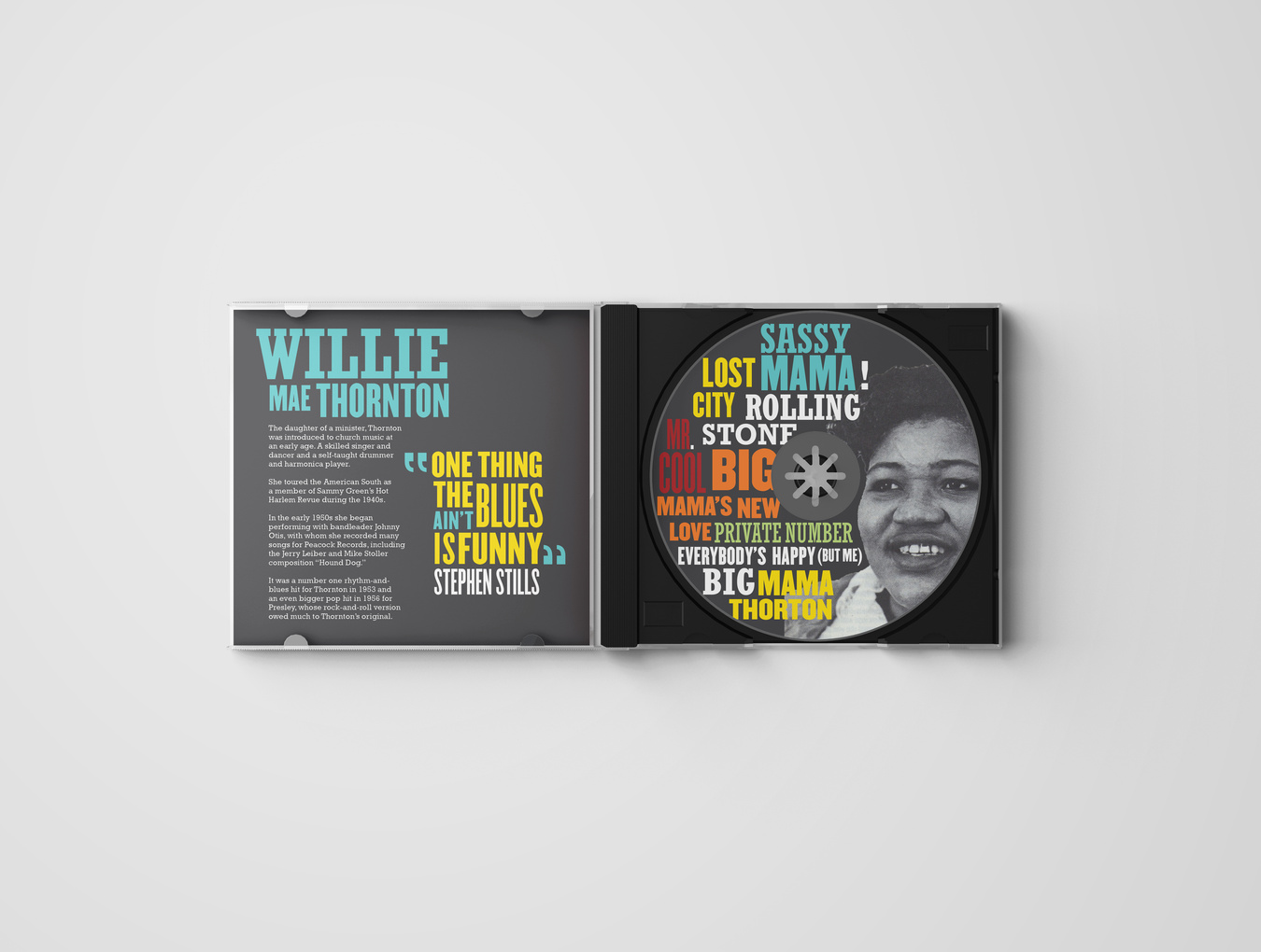 I selected Big Mama Thornton for a rebranding assignment, embracing the challenge of reviving an artist with limited existing content and paying homage to the genre and era she represented. It was difficult but fun, merging vintage typography with a vibrant color scheme to pay a playful tribute to her roots.